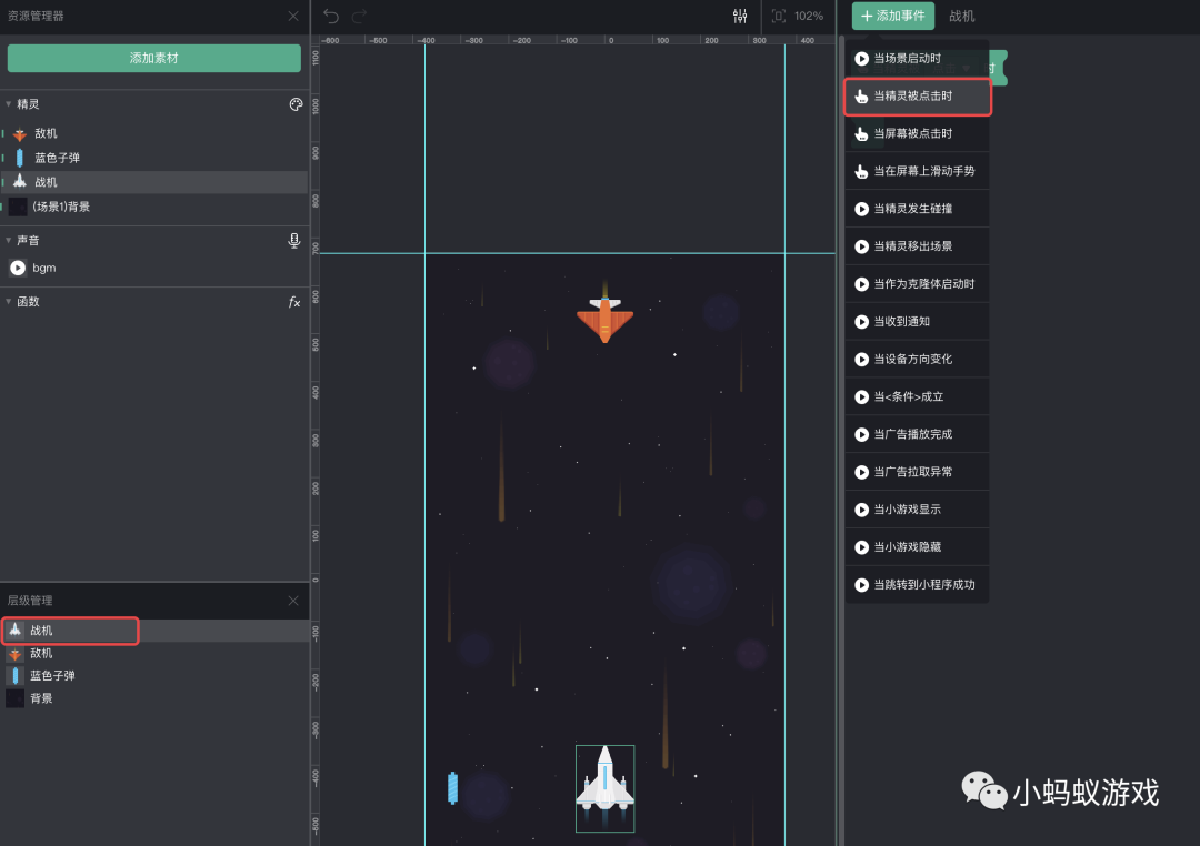 在“层级管理”中选中战机,点击“添加事件”,选择“当精灵被点击时”。