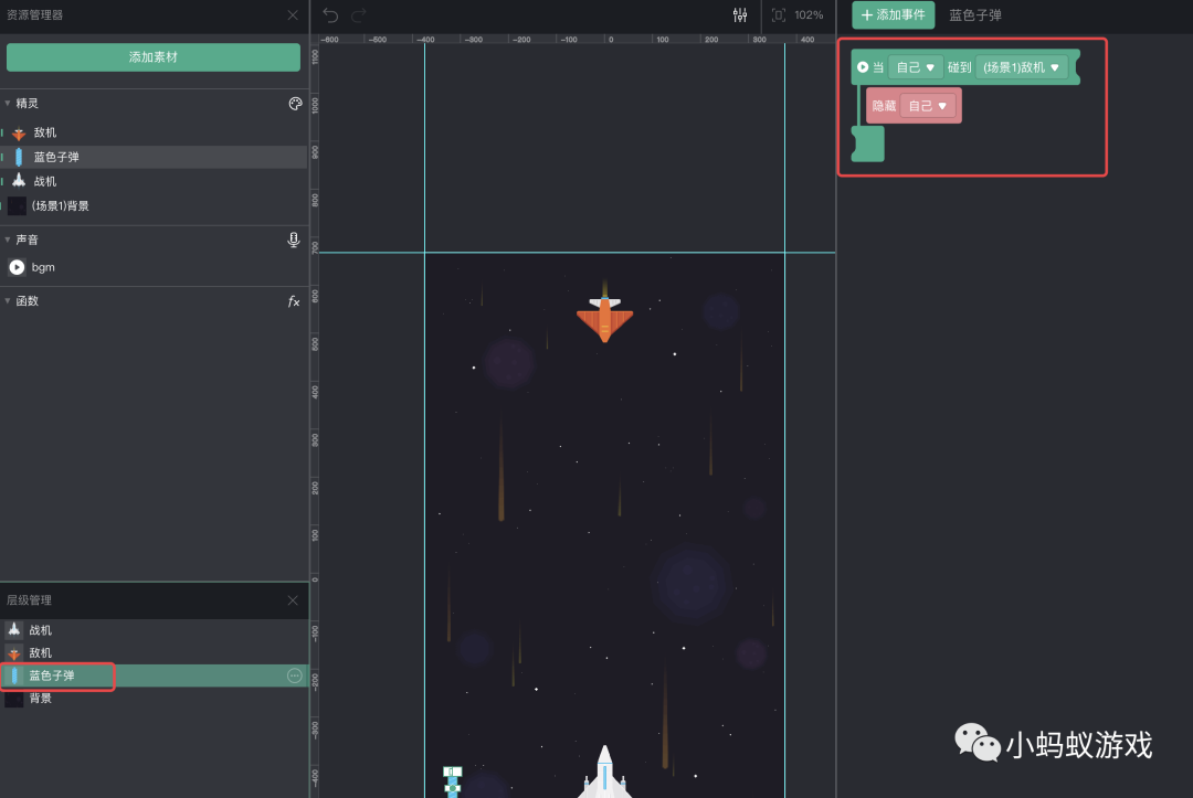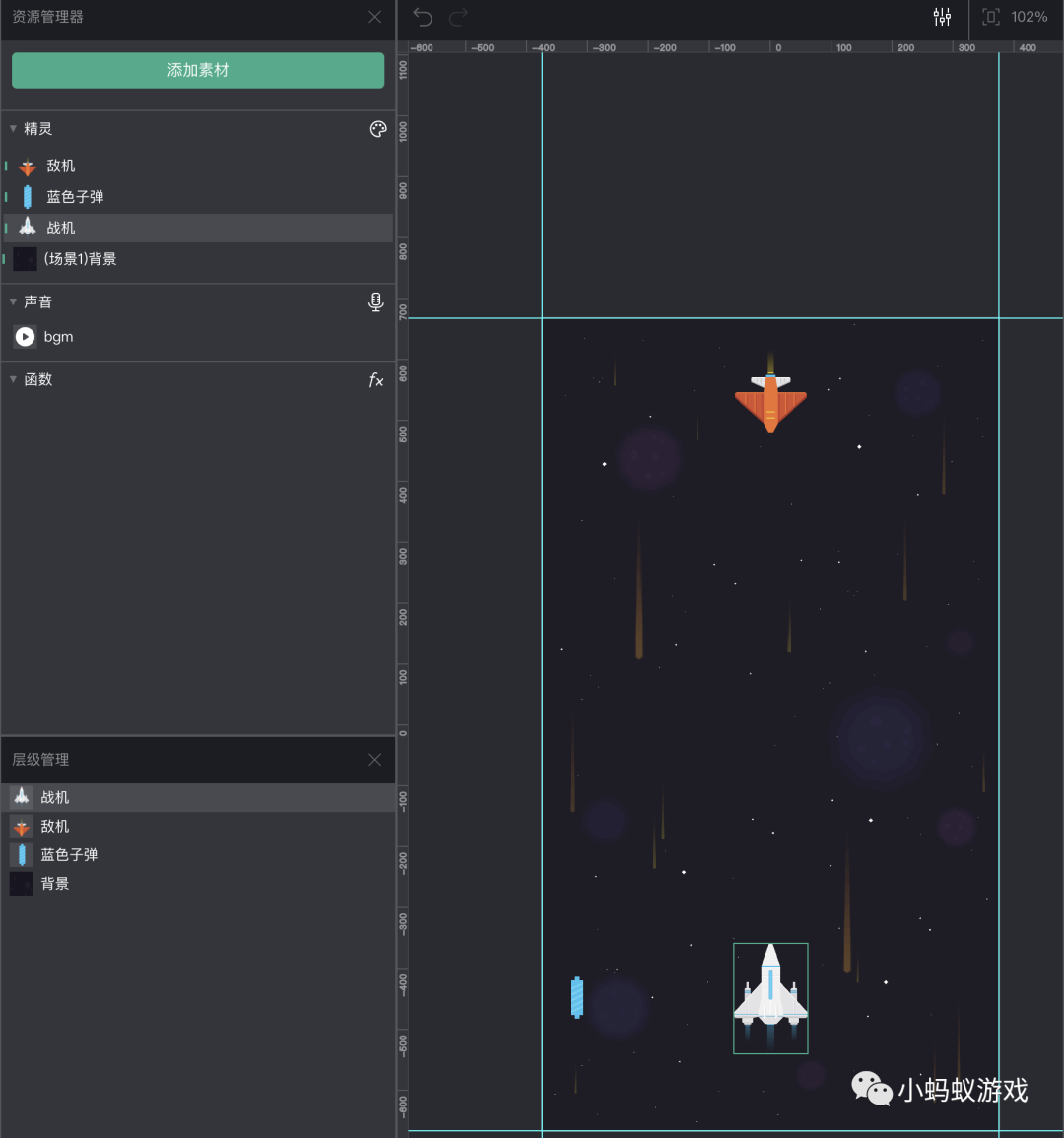 如图,我们导入了“战机”,“敌机”以及一枚“蓝色子弹”。将“敌机”放置在“战机”的正上方,以便与我们发射的“子弹”可以打中它。