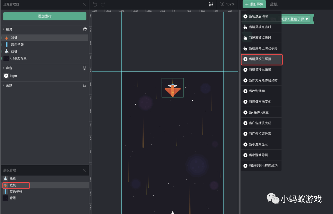 在“层级管理”中选中“敌机”,点击添加事件,选择“当精灵发生碰撞”。