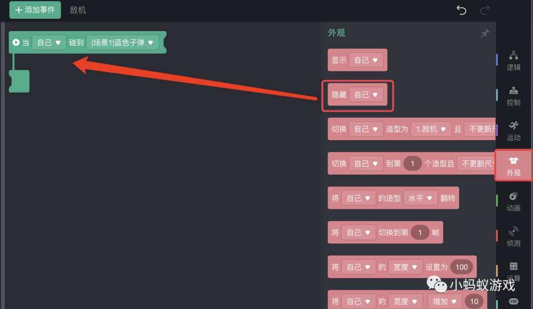 这里,我们简单的使用“隐藏自己”积木块来模拟爆炸。