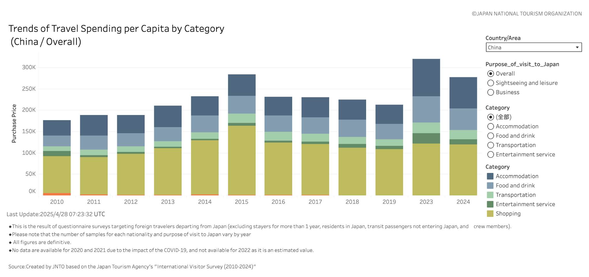 - 通过日本国家旅游局发布的2024年的数据可以得知,中国游客前往日本的支出中,住宿支出占比第二,达到26.4%,金额达到73143日元。显示出中国游客在日本住宿场景下的高消费力。