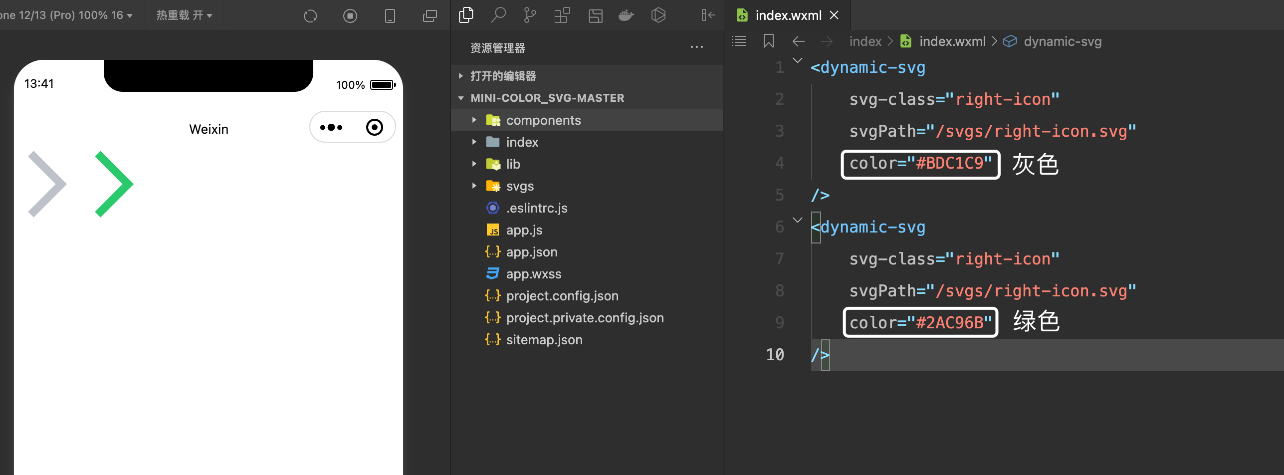 本文章采用 base64替换的方案 来实现下动态svg,以支持相似svg在颜色差异下的一图复用,比如:箭头、logo、物品使用状态图戳等。以尽可能极减少了svg的数量,提高了小程序的加载速度。展示效果如下(本地仅有一个right-icon.svg文件,通过传入color颜色差异可以实现svg的颜色调整):