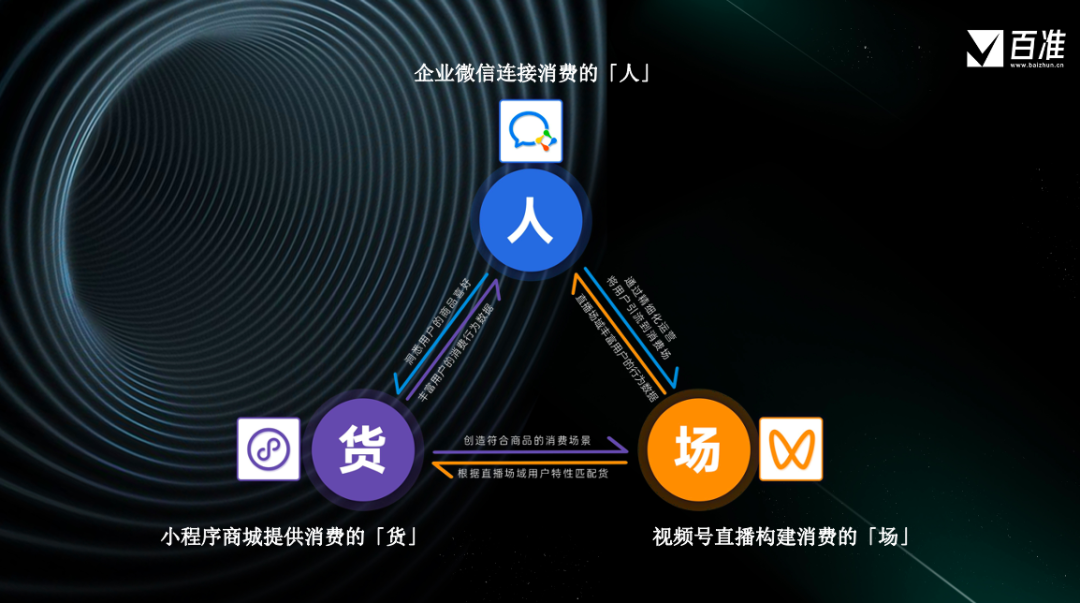 最终,视频号作为一个前端的引流工具,发挥”场“的功能;企微作为“人”的留存载体,小程序承载“货”的货架功能,同时能够引流跟裂变,三个节点相互扣合,形成了新的流量全域。各个生态的打通,让人货场紧密耦合,形成了1+1>2的效应,甚至是1+1+1>3,共同相互促进。
