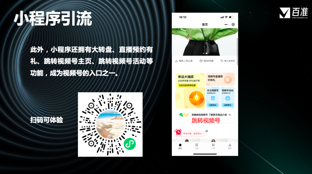 跟整个微信生态打通的小程序不仅可以跳转直播、活动,还可以通过小程序直接关注公众、视频号。视频号也可以通过小程序的载体,在微信生态的社交网络里进行裂变、引流的传播。