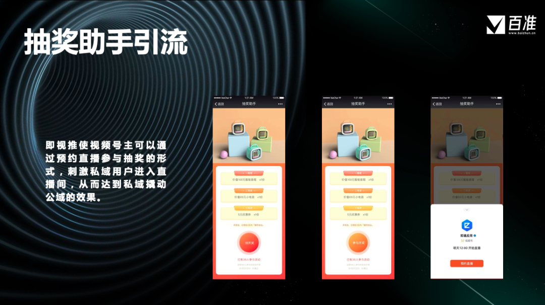 小程序也可以给视频号进行引流。小程序的预约功能,可以利用社交网络把视频号的预约分享出去进行引流,也可以通过抽奖的方式激励用户,实现私域社交网络的动员。