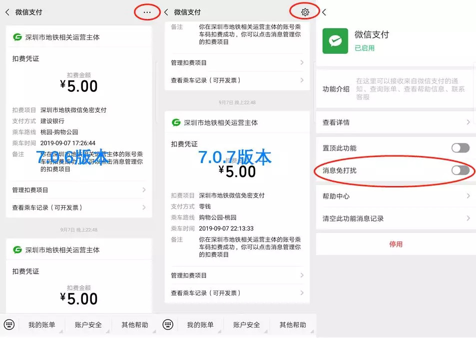 微信支付通知页面右上角将原来的“…”改为齿轮icon。点击齿轮,用户可以选择停用微信支付的消息服务,停用该功能的同时会清空历史数据。
