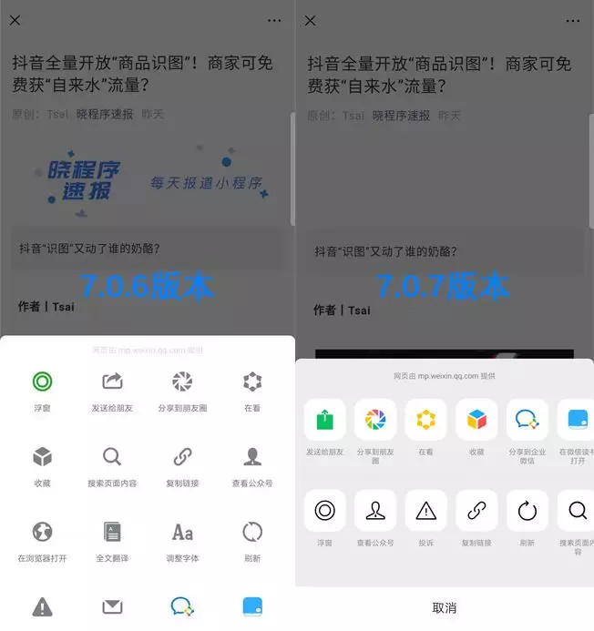 如果说小程序“…”页面改版后只是近似iOS版微信界面,那么公众号“…”页面的改版,可谓是出自同一个模子了。