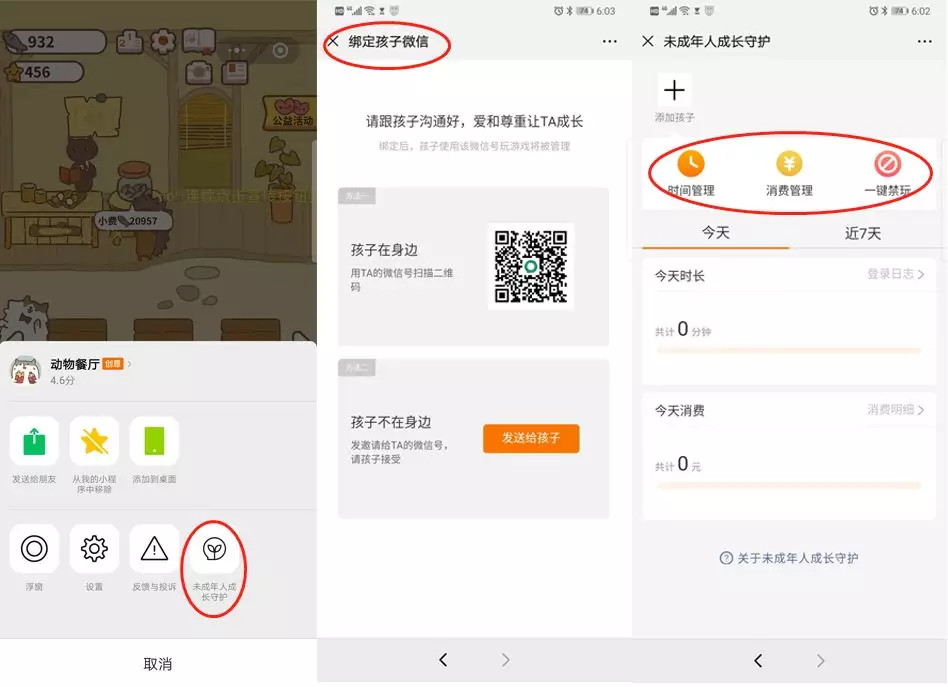 在“未成年人成长守护”功能页面,家长可以通过绑定孩子微信,进而实现对孩子的游戏时间管理、消费管理、一键禁玩等功能。