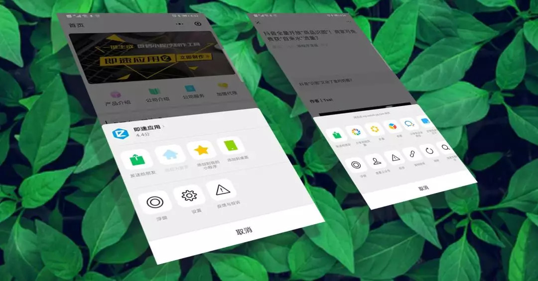第二部分是小程序互动功能,它将原来的转发、收藏、添加到桌面等功能,从简单的文字转变为“图标+文字”的按钮形式(ps:这种图标形式是不是像极了iOS,不过这还不是最像的,最像的还在下面),本质上是强化小程序与用户之间的交互动作。