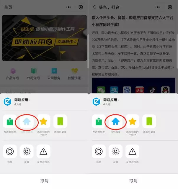 值得注意的是,原来只在小程序其他页面才会出现的“回到首页”,如今也成为这一栏目的固定按钮。如果当前为首页时,图标处于浅色状态,如果非首页,图标则显示深色。