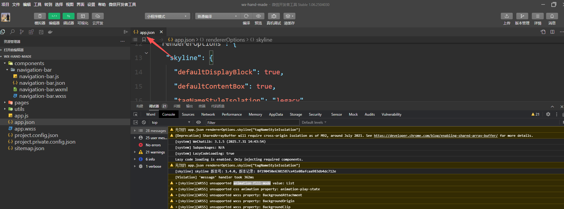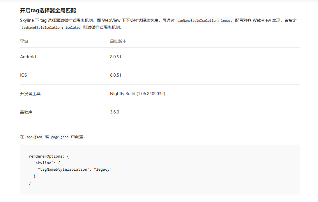 你比如一个警告【无效的app.json rendererOptions.skyline["tagNameStyleIsolation"]】,