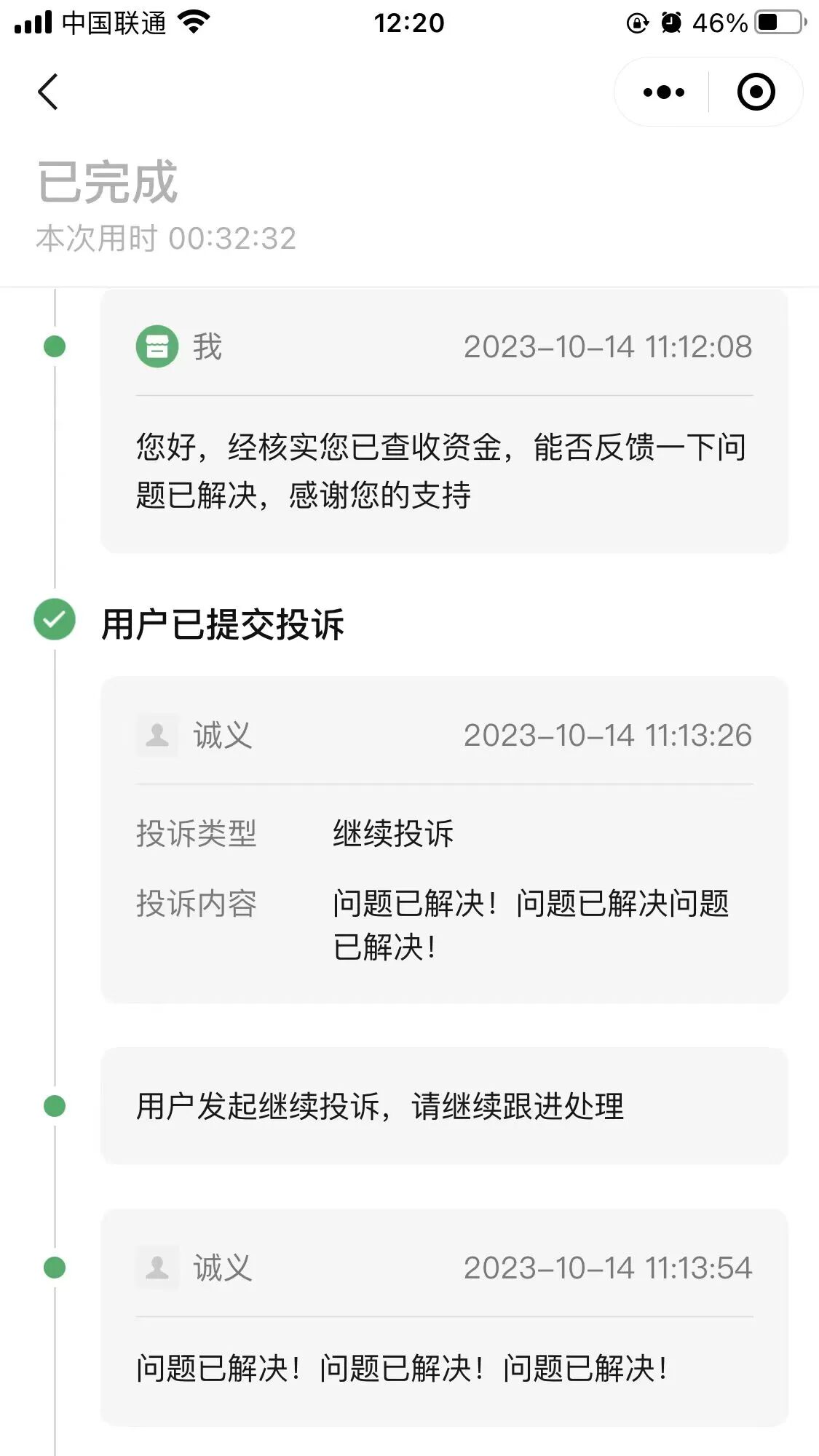 ③商户通过投诉交互功能协商,确认投诉已协商达成一致,点击处理完成,用户点击“已解决”且用户不再重复投诉。