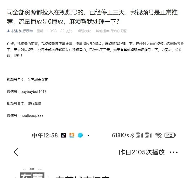 我的两个视频号“东莞城市探索”(微信号:buybuybuy1017)和“流行厚街”(微信号:houjiepop888)目前虽处于正常推荐状态,但流量播放量却为 0 。此前我已对相关视频内容进行了删除整改,绝无意对抗规则。
