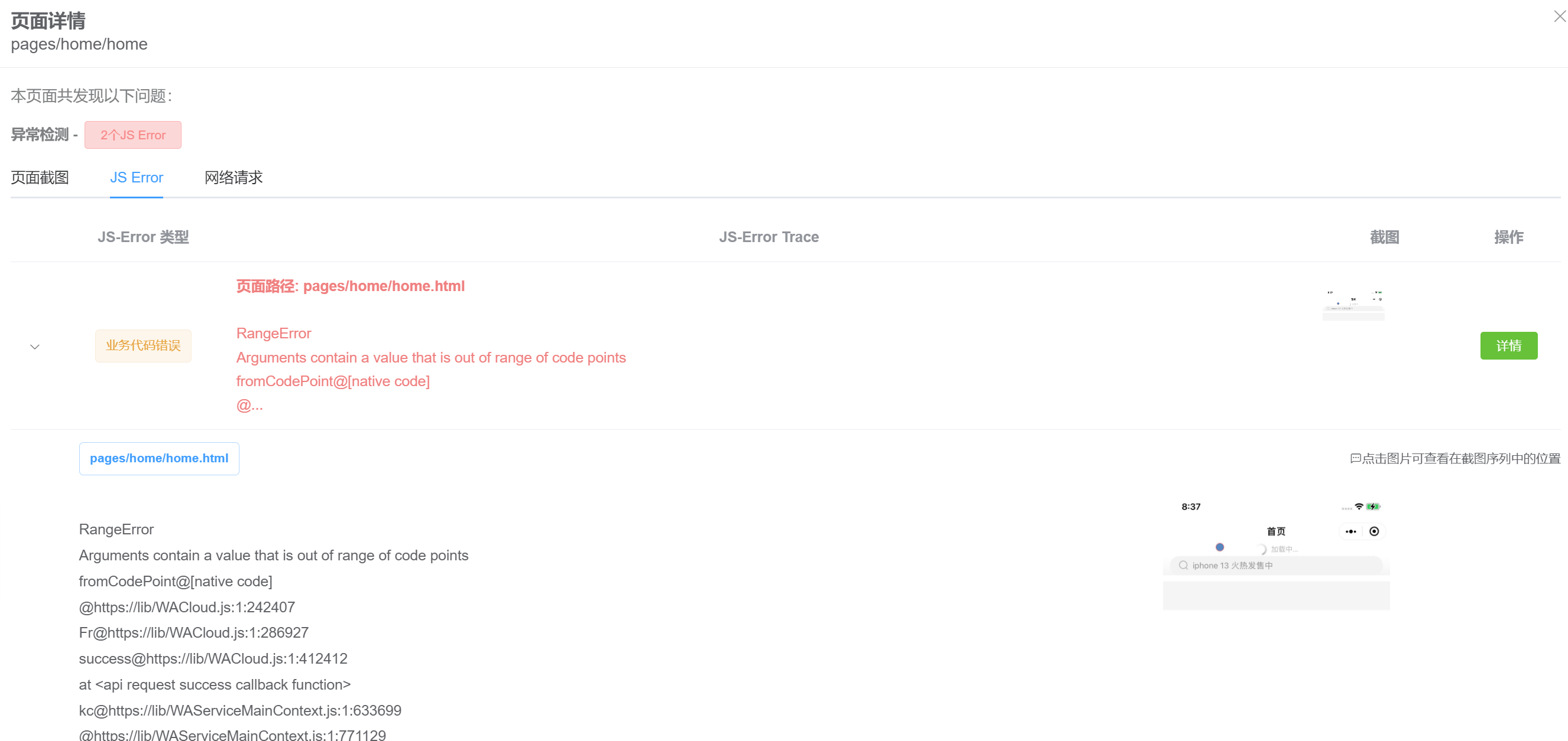 这里小程序A使用Monkey作为自动化测试方案。一般情况下,首页内容是正常加载的,但是当服务器压力较大,网络返回较慢时,小程序A出现了JSError问题