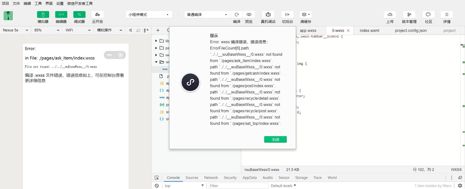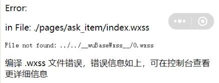 Error: wxss 编译错误,错误信息:ErrorFileCount[6] path `../../__wuBaseWxss__/0.wxss` not found from `./pages/ask_item/index.wxss`.