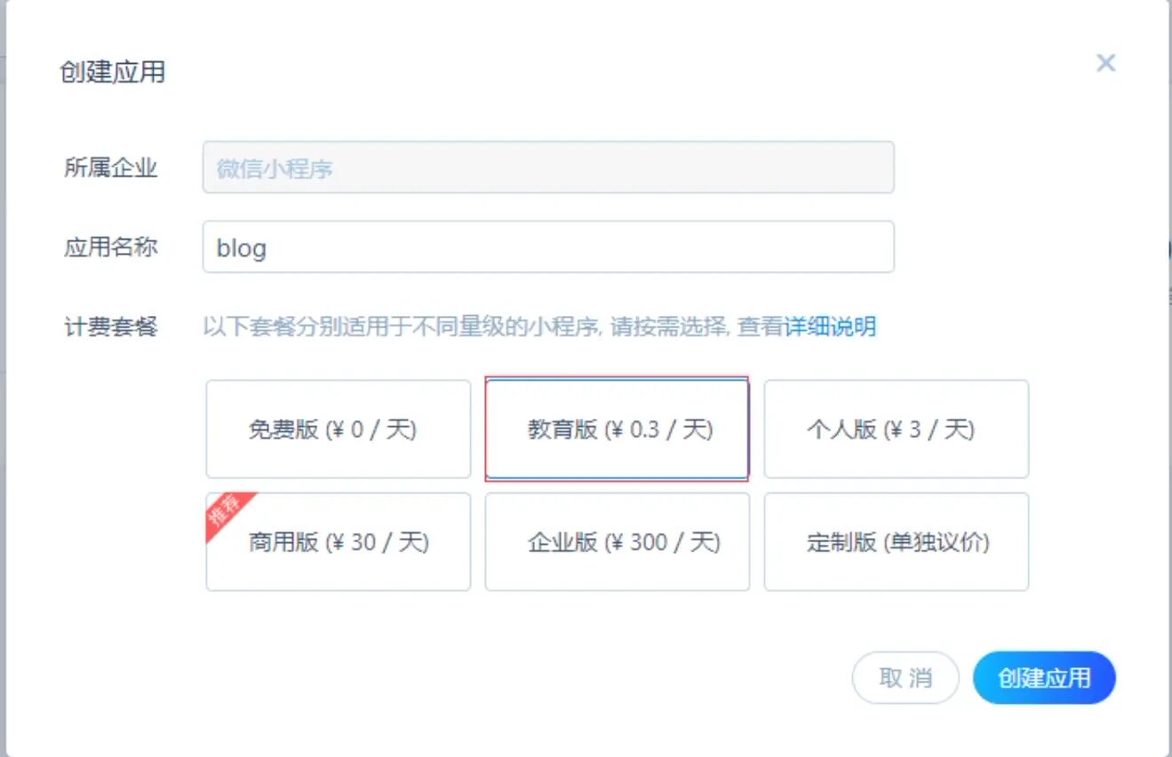 选择套餐教育版创建名为blog的应用