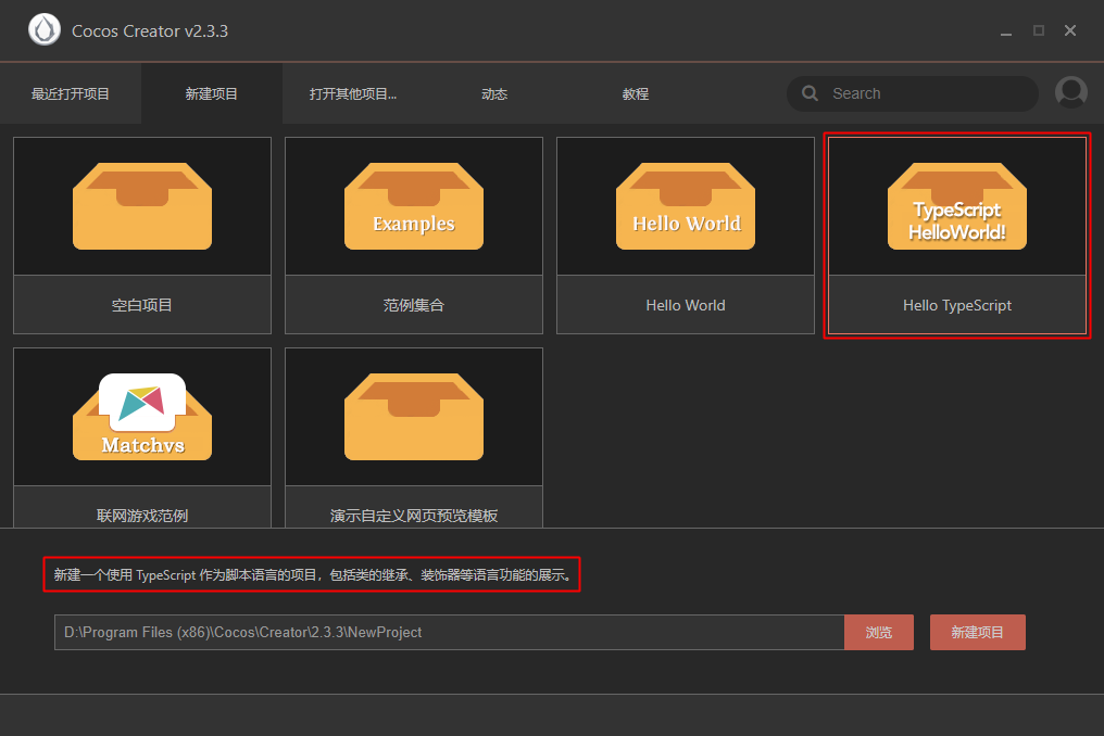 新建项目时,在项目模板中选择 Hello TypeScript ,就可以创建一个含有 TypeScript 相关配置和基本组件的项目。