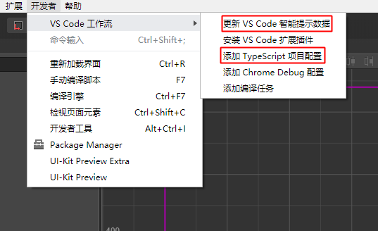 想要在原有的 JavaScript Creator 项目中使用 TypeScript ,需要点击编辑器上方主菜单的 [开发者 -> VS Code 工作流 -> 更新 VS Code 智能提示数据] 和 [开发者 -> VS Code 工作流 -> 添加 TypeScript 项目配置] 来给项目添加 creator.d.ts 声明文件和 tsconfig.json 配置文件。
