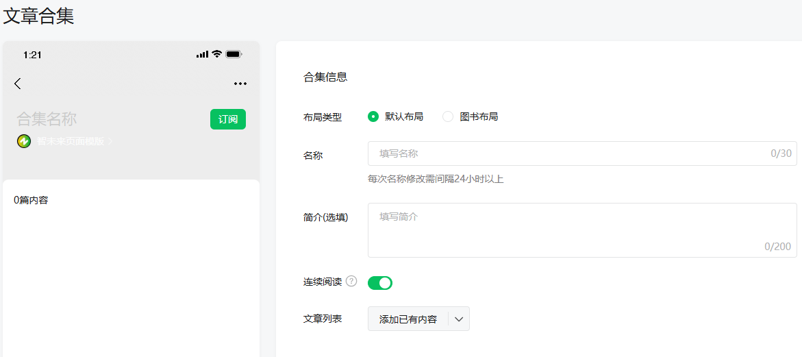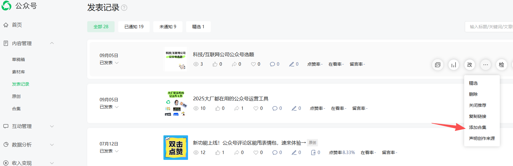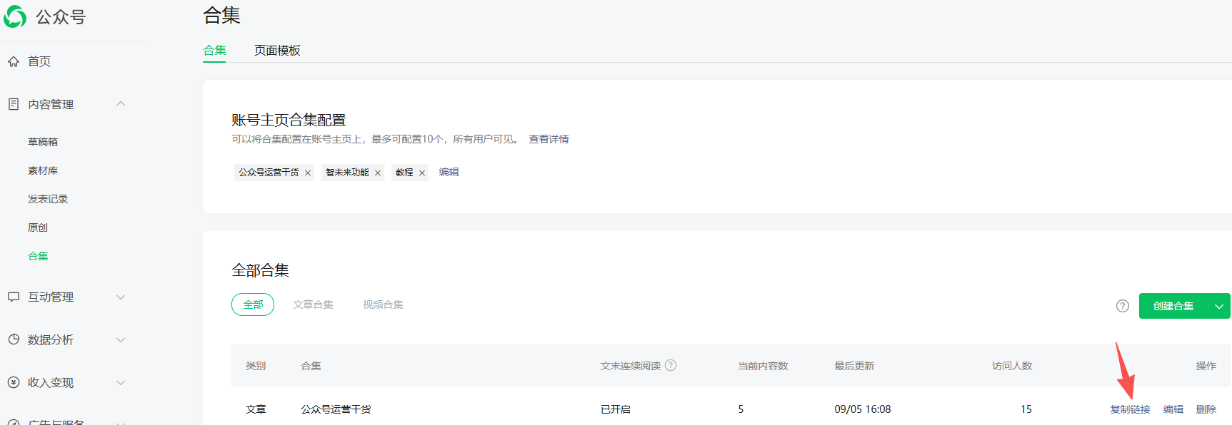 合集的作用,一个合集可以包含多个文章,但一个文章只能属于一个合集: