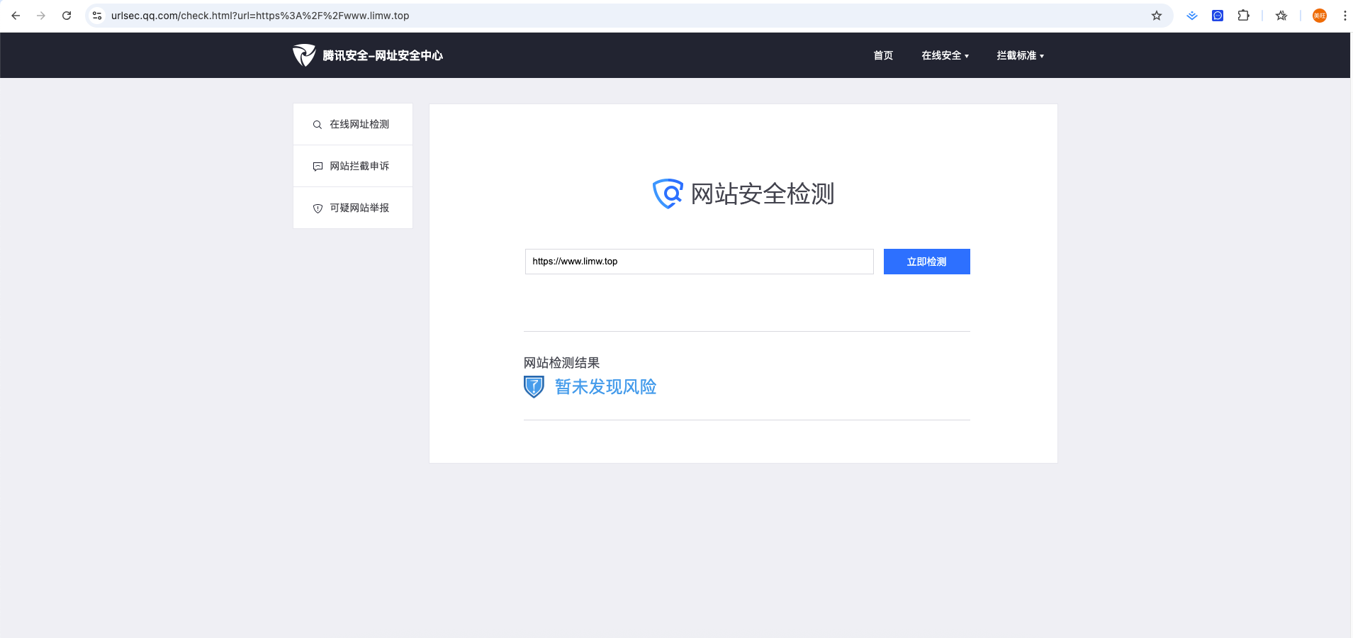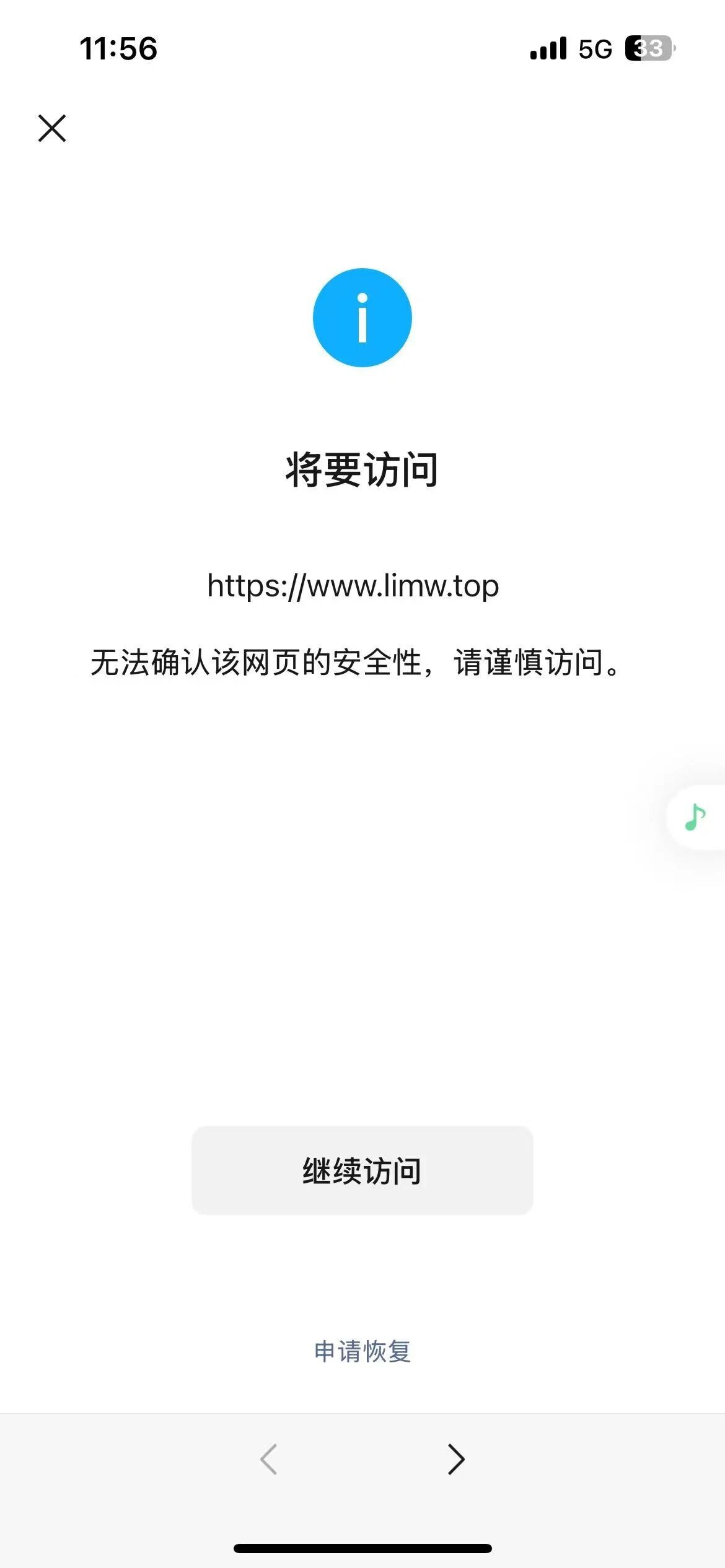 您好,域名https://www.limw.top备案是正常的,浏览器访问正常,我是网站开发者,微信访问网站出现“无法确认该网页的安全性,请谨慎访问”,经检查网页里没有不安全的内容,且已进行过备案,腾讯安全-网址安全中心检测也没有发现风险,请核实后帮忙解除拦截,谢谢。