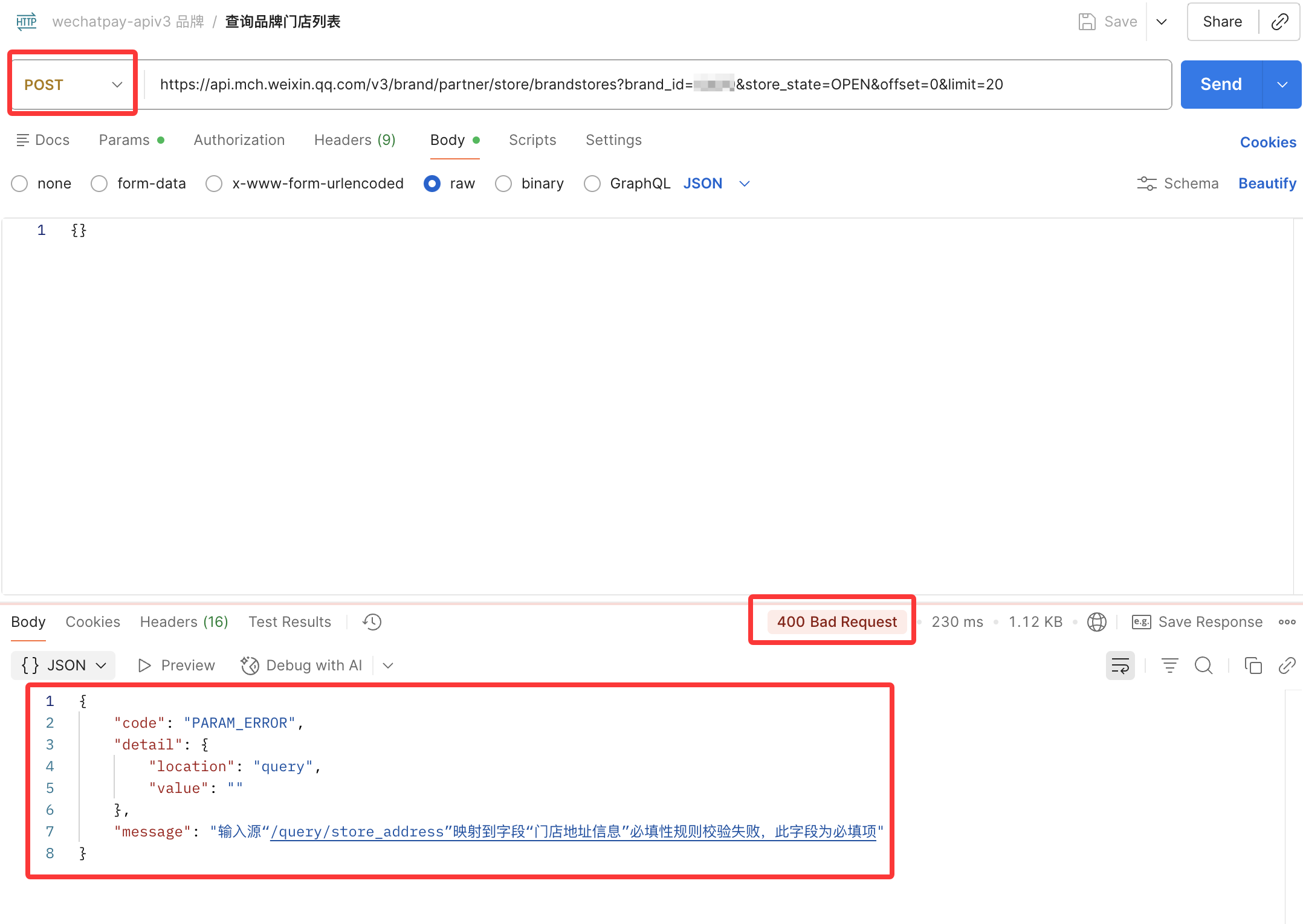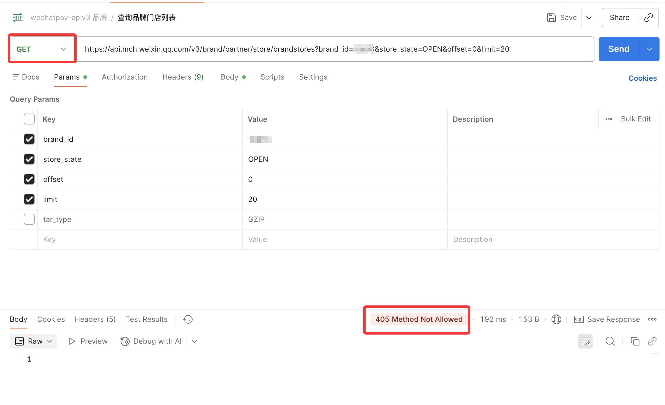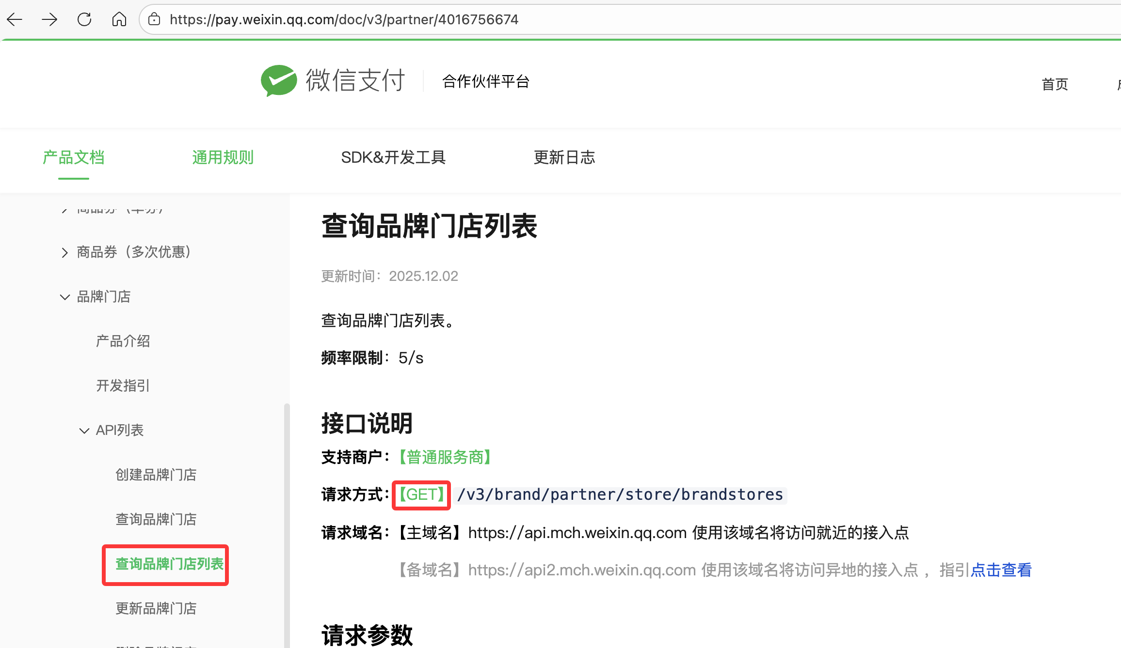 /v3/brand/partner/store/brandstores - 接口文档地址:https://pay.weixin.qq.com/doc/v3/partner/4016756674 按照文档说明,应该使用 GET 请求