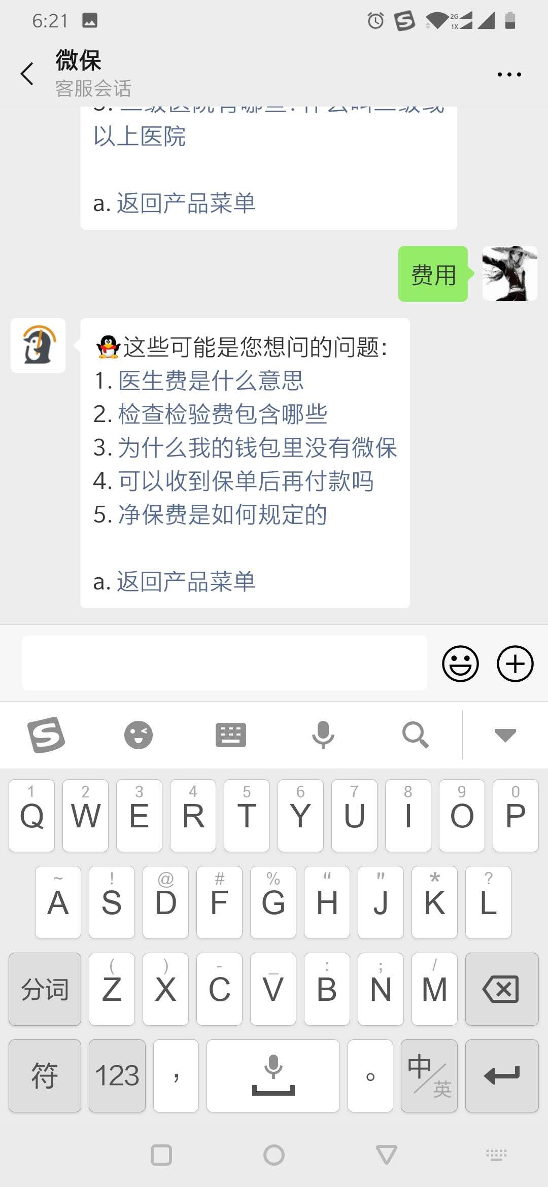 分析:微保的玩法,是最为典型的转人工+菜单+机器人的模式,由企业知识库来承担自动化客服的部分,由人工来承担自动化客服不能承担的部分。