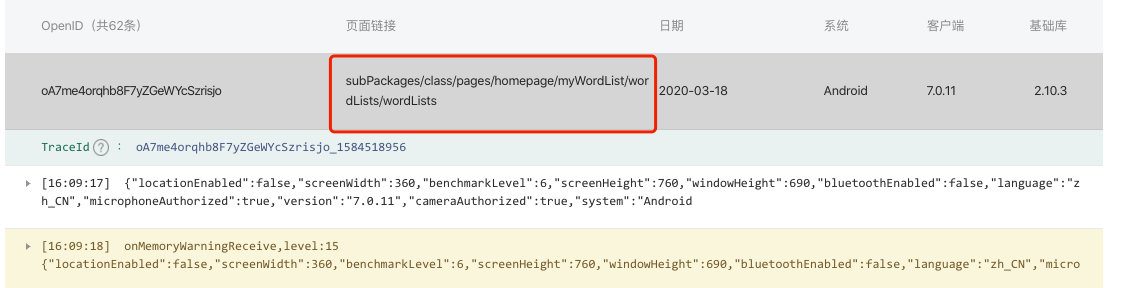 - 为了定位问题方便,日志是按页面划分的,某一个页面,在onShow到onHide(切换到其它页面、右上角圆点退到后台)之间打的日志,会聚合成一条日志上报,并且在小程序管理后台上可以根据页面路径搜索出该条日志。
