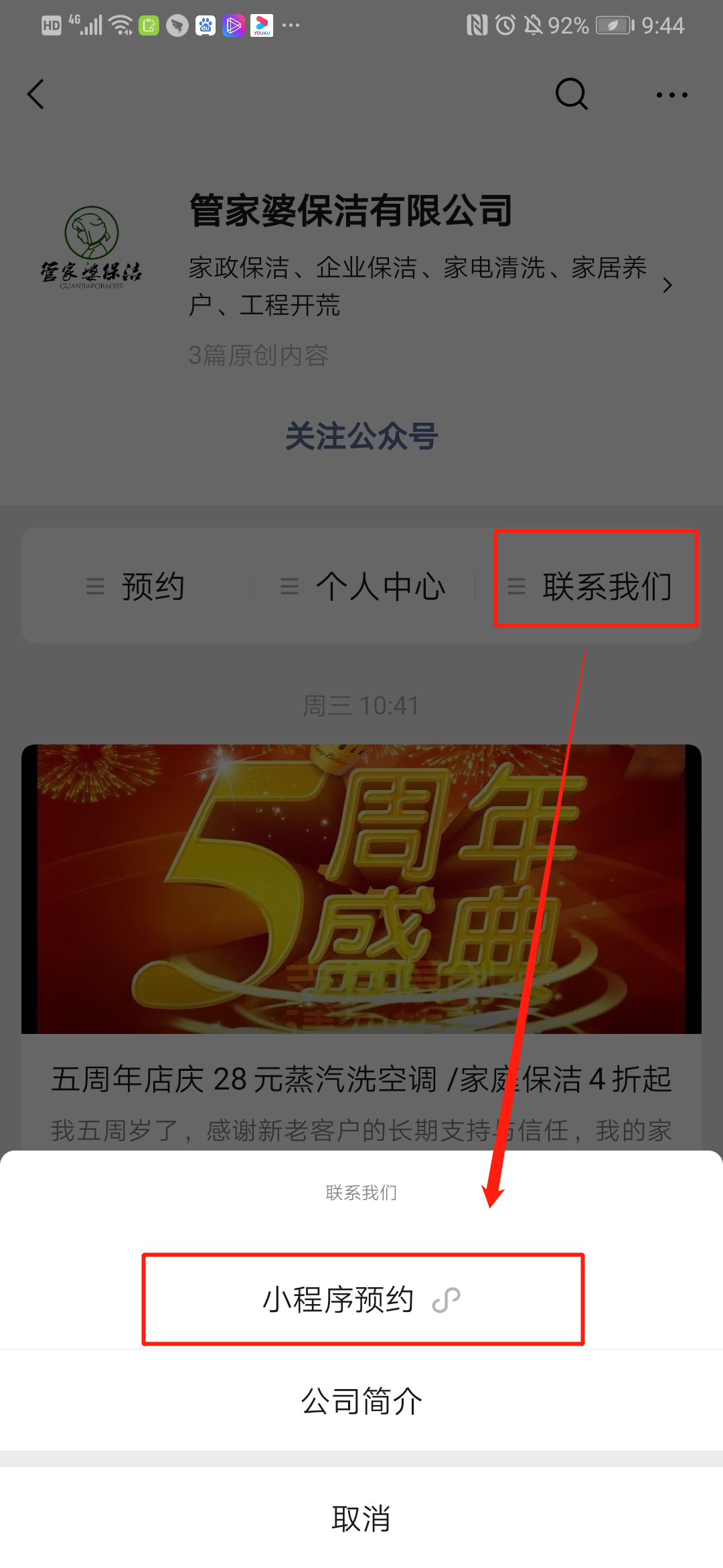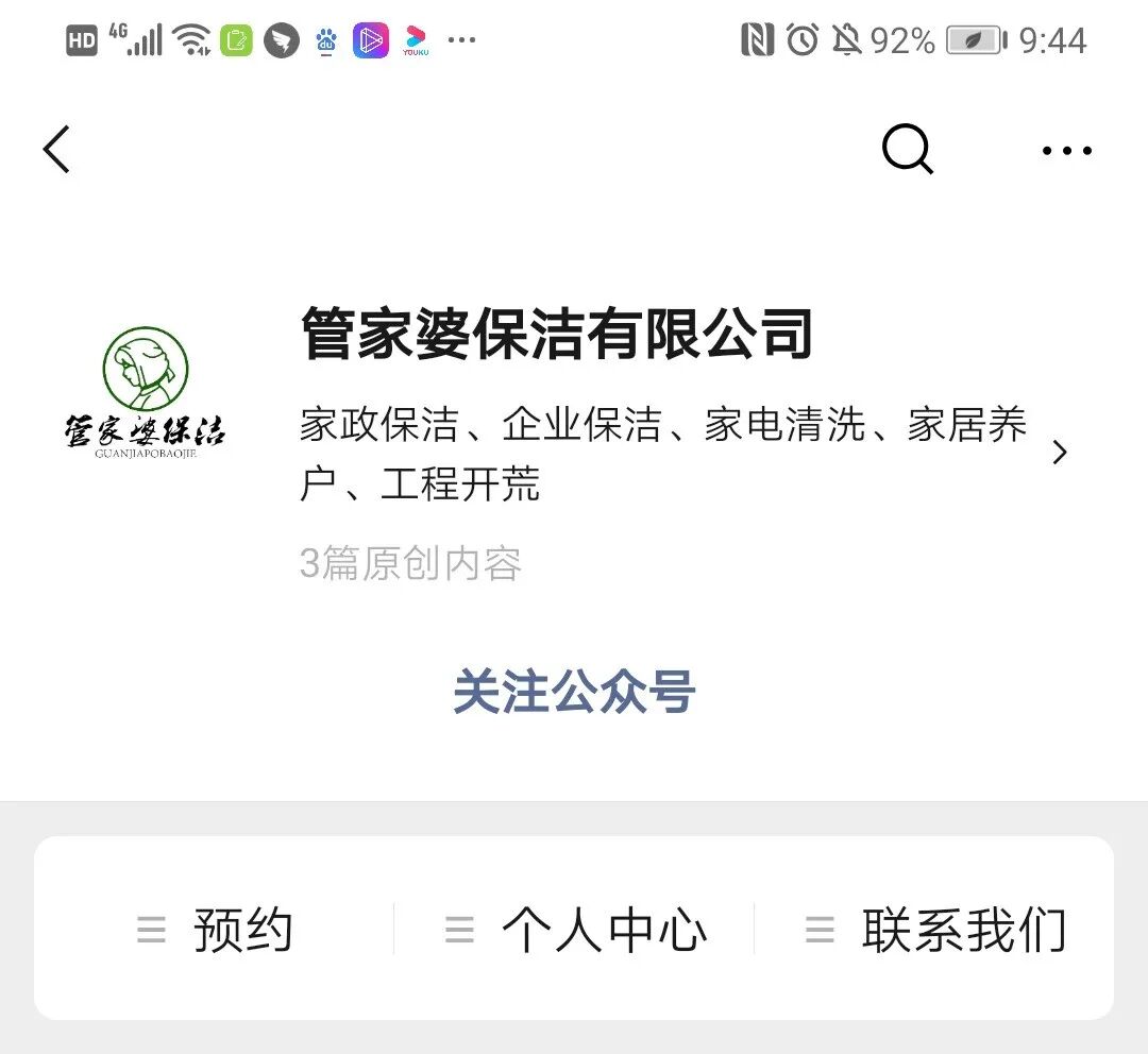 一方面,管家婆保洁还建立了微信公众号,不仅方便了客户线上预约、线上下单来满足顾客的个性化需求,同时还通过了公众号的内容展示,让企业的服务形象更加深入人心。