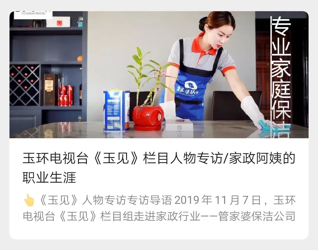 比如,客户可能会担心自己不看着,清洁会不干净,公众号输出通过玉环电视台《玉见》栏目人物专访了解家政阿姨的职业生涯,让客户了解到平时服务他们的阿姨在她们没看到的时候在客户家里是怎么工作的;