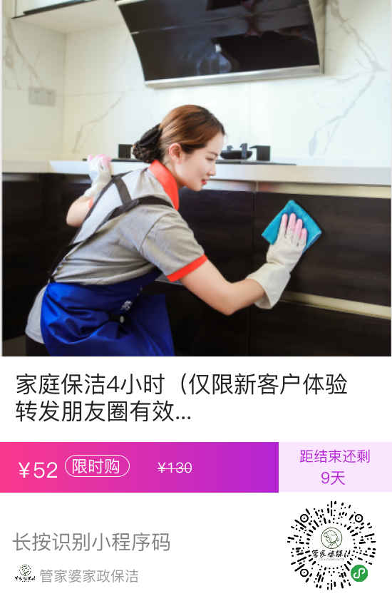 用户福利2:将活动文章链接转发至当地业主群,朋友圈保存一天,截图发给客服,可以获得52元4小时家庭清洁服务(仅限新客户,原价130元);