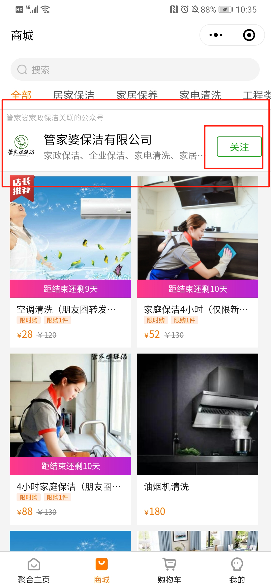 假设你是老客户,你参加周年店庆活动,家庭保洁只能选择活动3(88元),比原价方案(130元)便宜了很多,但是这时候你看到活动2(52元),新客参加更便宜!你可以把活动发到家族群里,让自己的老公或者婆婆去参加,这样你获得了你满意的价格,商家又增加了客流。