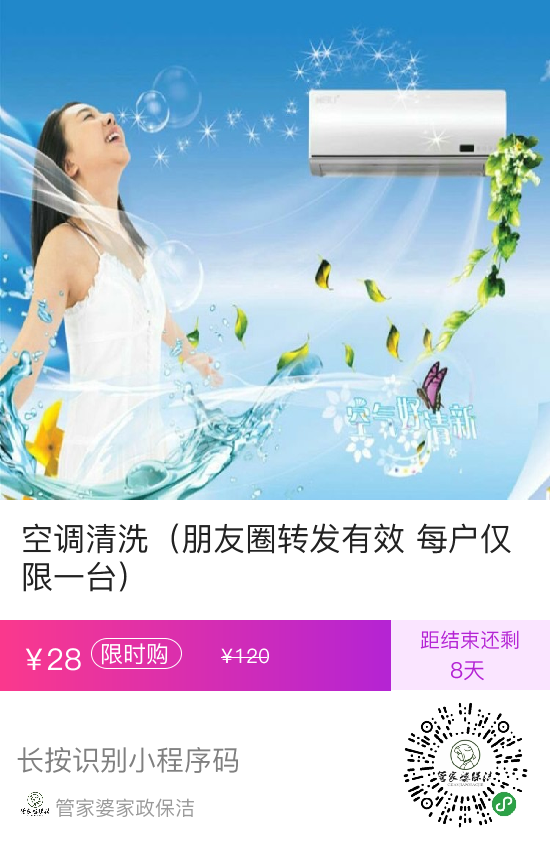 用户福利1:将活动文章链接转发至当地业主群,朋友圈保存一天,截图发给客服,可以获得一个28元的空调清洗名额(原价120元);