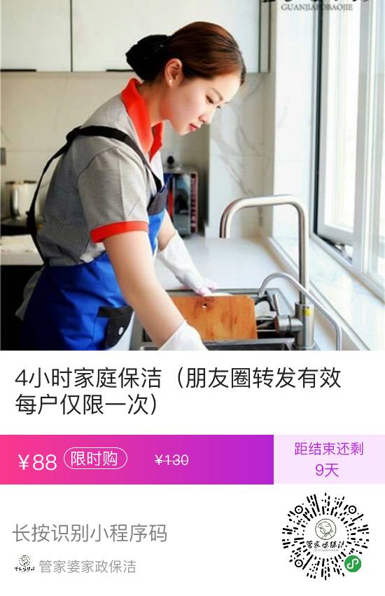 用户福利3:将活动文章链接转发至当地业主群,朋友圈保存一天,截图发给客服,可以获得88元4小时家庭清洁服务(原价130元)