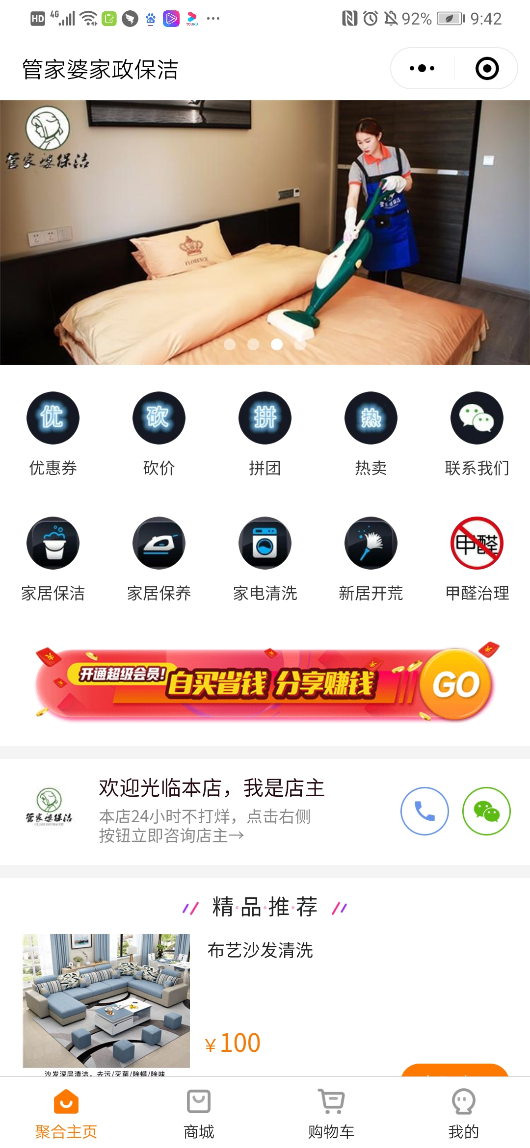 为了克服传统家政服务模式弊端,提升顾客体验感和提高管理效率,2018年4月,管家婆保洁通过有客上线了线上小程序商城,开始尝试“家政+互联网”模式。扩充商品种类满足个性化需求;利用砍价、拼团、优惠券、限时购等功能快速实现客户增长,有效提升店铺获客数和下单率。
