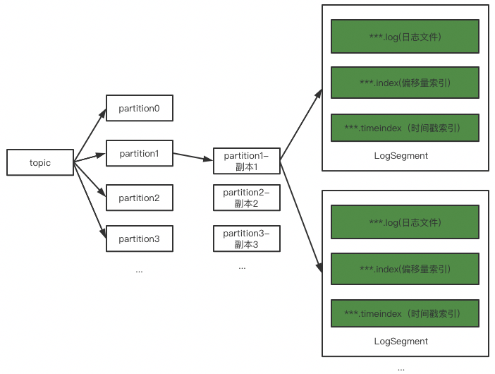 Partition 是以文件的形式存储在文件系统中,比如创建一个名为topic1的topic,其中有3个partition,那么在kafka的数据目录(/tmp/kafka-log)中就有3个目录,topic1-0~2,命名规则topic_name-partition_id,创建3个分区的topic文件目录。每个目录下会有三个文件,一个log文件和两个索引文件(稀疏的偏移量索引和时间索引)。其中log文件又会按照规则去不停的切分为segment(默认1G一个),其他技术细节比如索引文件的技术细节、文件清理细节等感兴趣的可以自行查阅官网,此处不在详述。(消息存储文件参见:图-5)