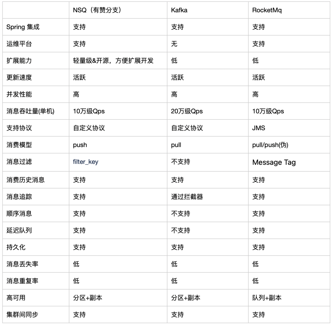 - 需要定制服务建议选择NSQ。NSQ对于扩展性最友好,比较轻量级可以方便的进行二次开发。