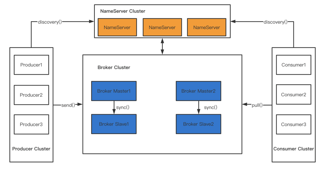 连接到相同NameServer下配置集群名称相同的broker会自动组成集群。根据配置文件参数会自动组成主从节点,主从之间进行数据同步(一般建议设置成同步复制+异步刷盘模式)。