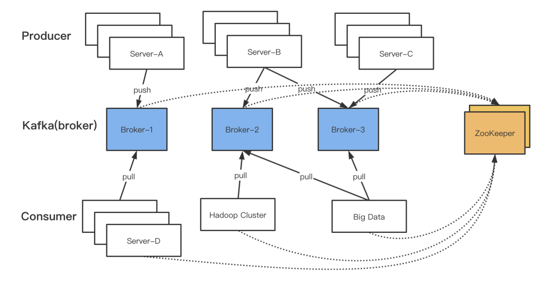 Kafka使用ZooKeeper来做管理、协调工作,利用ZK的有序节点、临时节点和监听机制等特性完成负载均衡、集群管理、选举等功能。例如每个broker节点启动时都会到ZK上进行注册,在/brokers/ids目录下创建自己的节点。消费者组协作消费一个topic时需要将消费者和分区关系注册到ZK中以确保每个topic分区仅被同组的一个消费者消费。同时ZK还负责存储topic、分区、消费者等元信息。(下文中会介绍到消费者组的消费索引相关信息,并未存储在ZK中)架构图参见:图-2