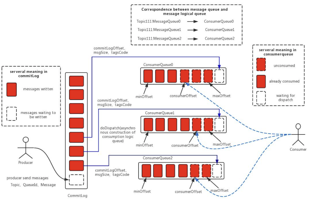 rocketMq在消息存储上设计思路与kafka和NSQ的思路不同,实际存储中既没有分区的概念,也没有按照topic进行存储。而是将所有topic的消息全部写入同一个文件中(commit log),这样保证了IO写入的绝对顺序性,最大限度利用IO系统顺序读写带来的优势提升写入速度。