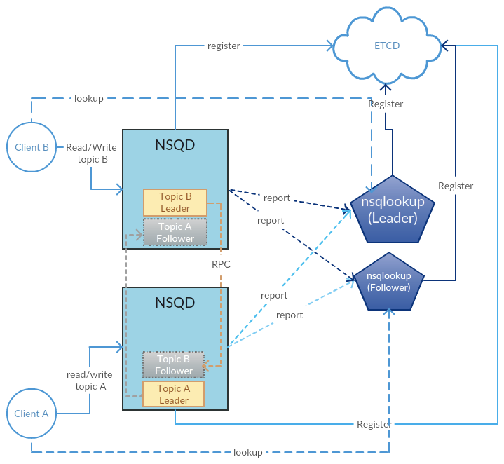 有赞NSQ将每个topic的数据节点副本元信息写入etcd,然后通过etcd选举出每个topic的leader节点。选举的leader节点负责自己topic的数据副本同步,其他follower节点从leader节点同步topic数据。当某个leader节点失效时, 会触发etcd的watch事件, 从而触发nsqlookupd重新选择其他存活节点作为topic的新leader, 完成leader的快速切换后继续向外提供服务。