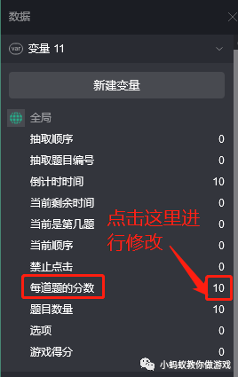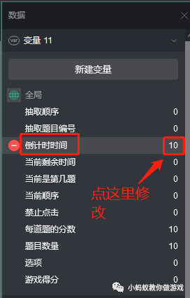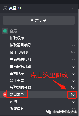 在项目的最右侧,找到一个叫做“题目数量”的变量,当前的值为 10,也就是说每次会随机的抽取 10 道题目,你可以对这个值进行修改,设置每次抽取的题目的数量。这里注意一下,题目的数量不能超过题库中的题目的总数量。