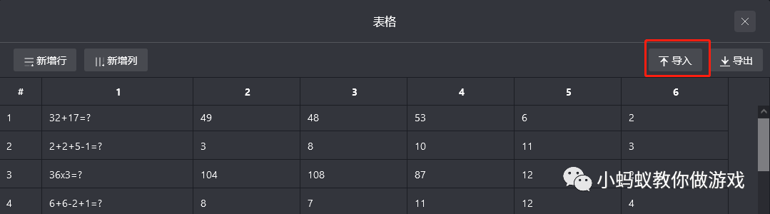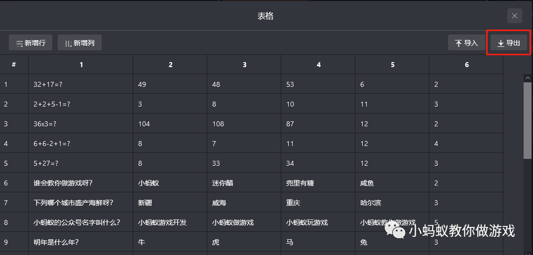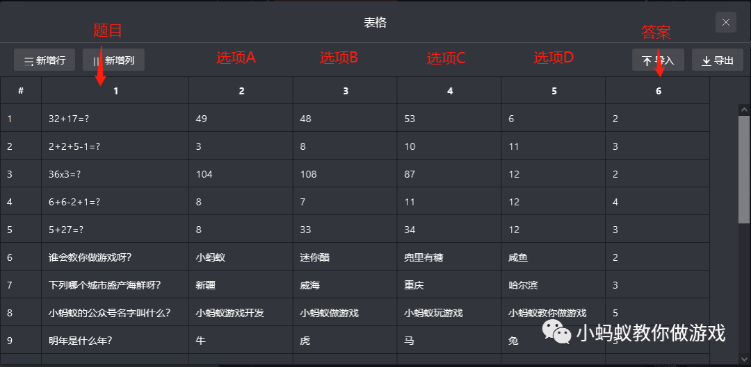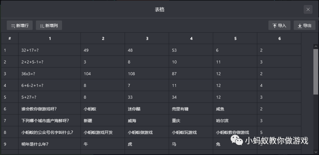 将会打开一个表格的编辑器,就像下面这样,下面的表格中显示的内容就是当前游戏的题库了。你只需要编辑这个表格,就可以制作自己的题库了。