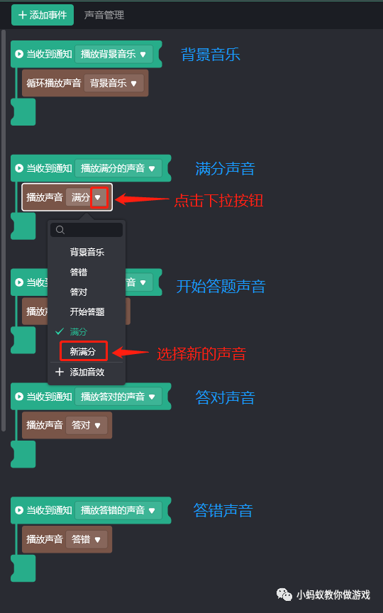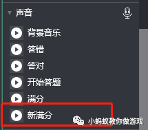 接着在右侧找到这些积木块,找到“播放声音满分”的积木,然后点击下拉按钮,选择“新满分”声音。