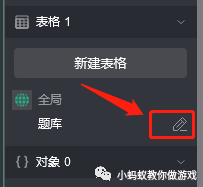 在你的工程界面的最右侧的”表格“中找到”题库“,点击右侧的小铅笔的图标。
