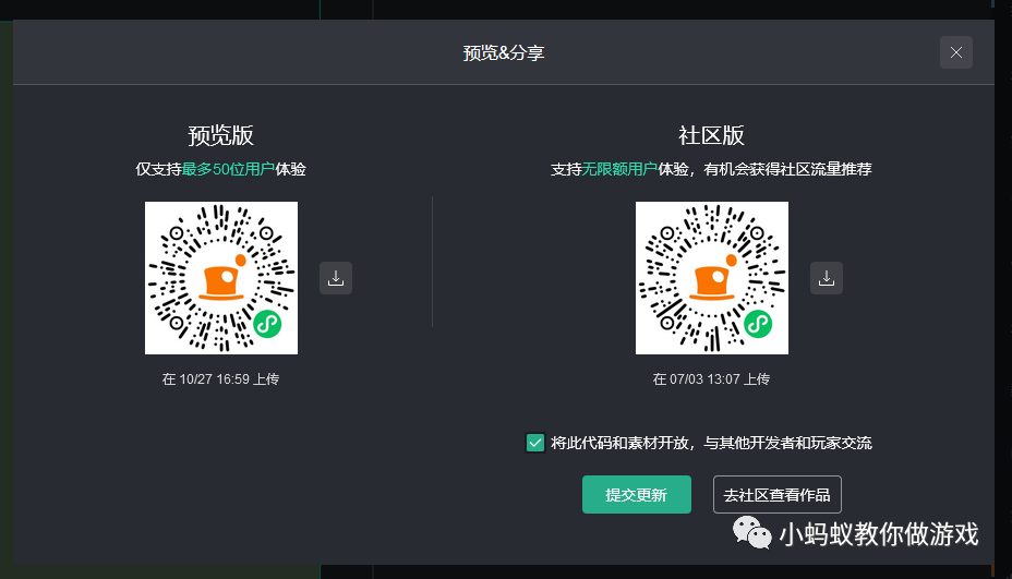 注:左侧的”预览版“最多支持50为用户体验,如果你想要更多人体验你的小游戏,可以在右侧发布为”社区版“。
