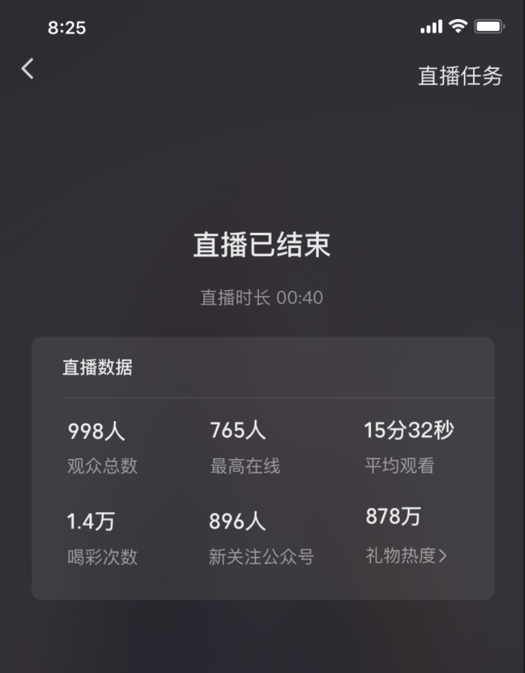 主播视角的直播结束页,将展示直播期间公众号的新增关注人数: