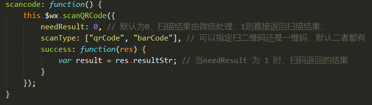 needResult: 0, // 默认为0,扫描结果由微信处理,1则直接返回扫描结果,