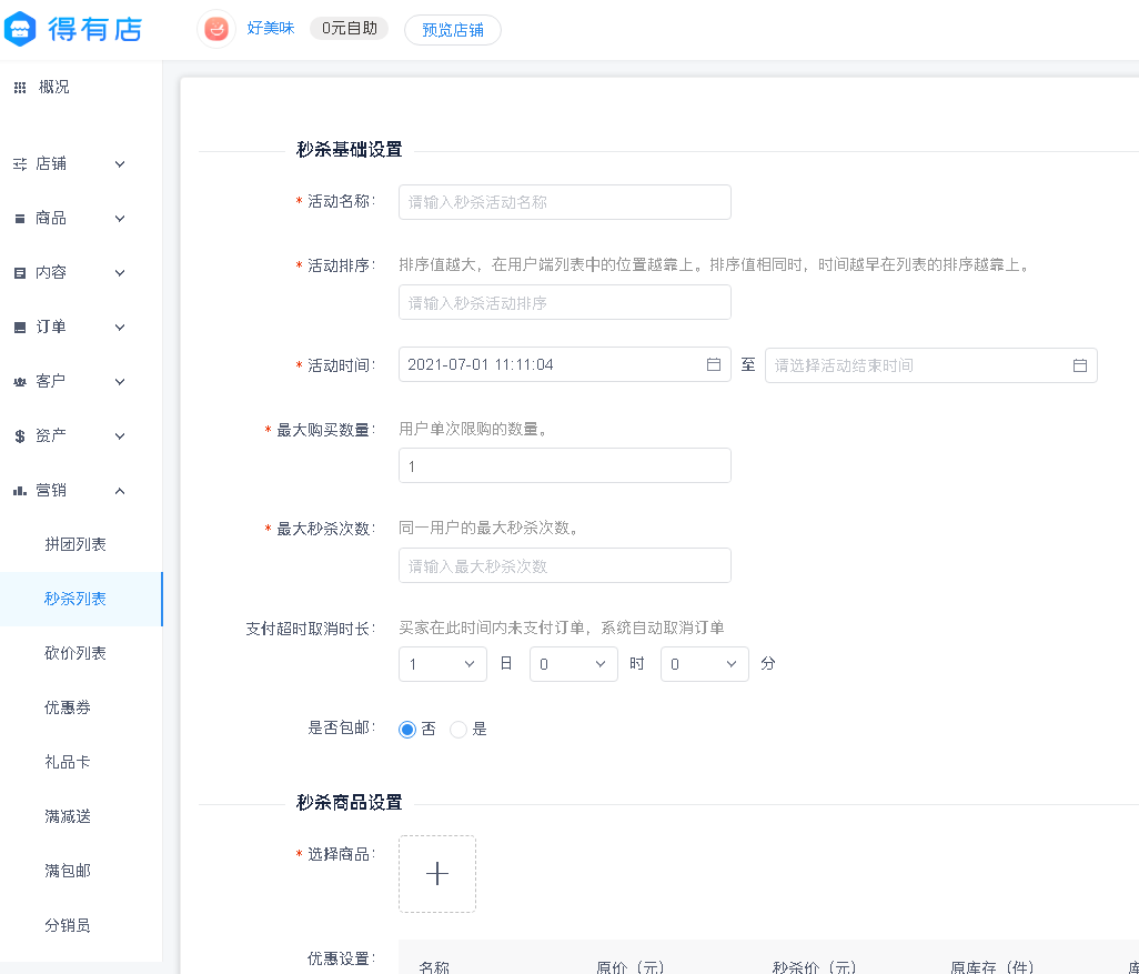 没有小程序的,使用“得有店”快速搭建小程序即可,进入得有店商家管理后台,发布秒杀活动。