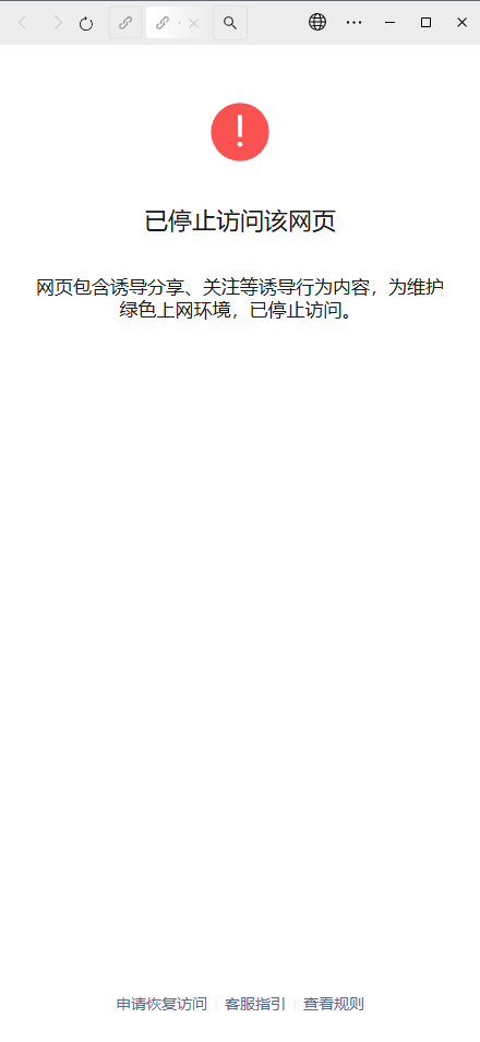 “已停止访问该网页。网页包含诱导分享、关注等诱导行为内容,为维护绿色上网环境,已停止访问。”