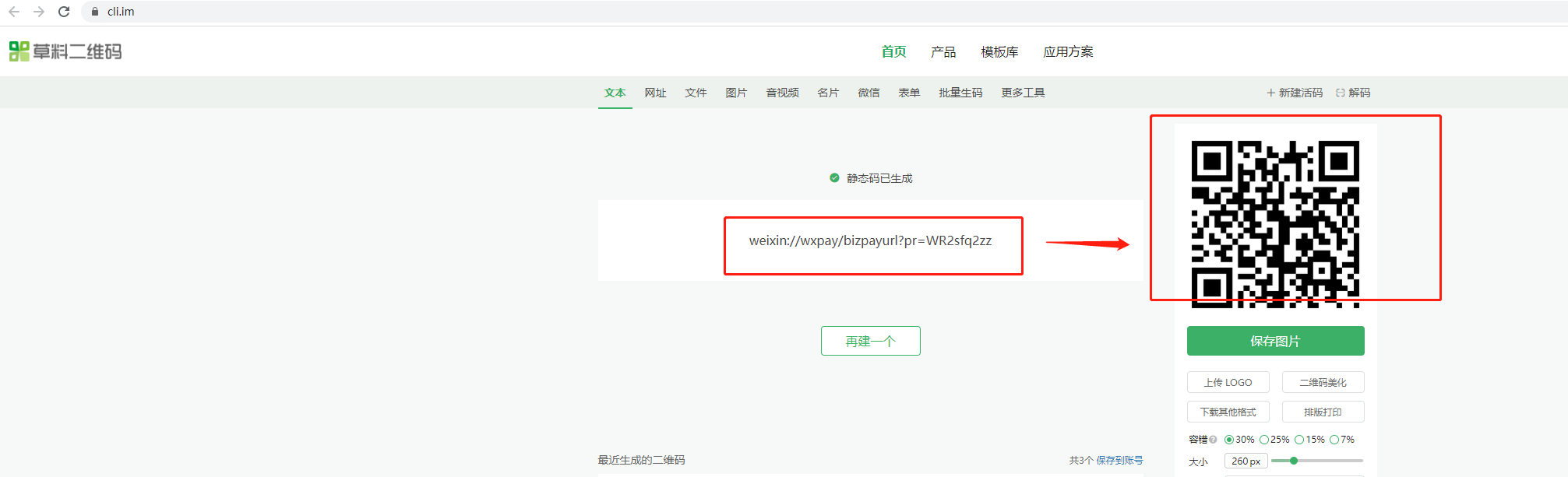 都没有问题就可以收到code_url,复制到草料网上,如下图